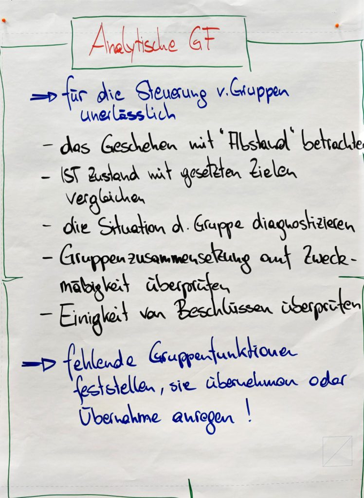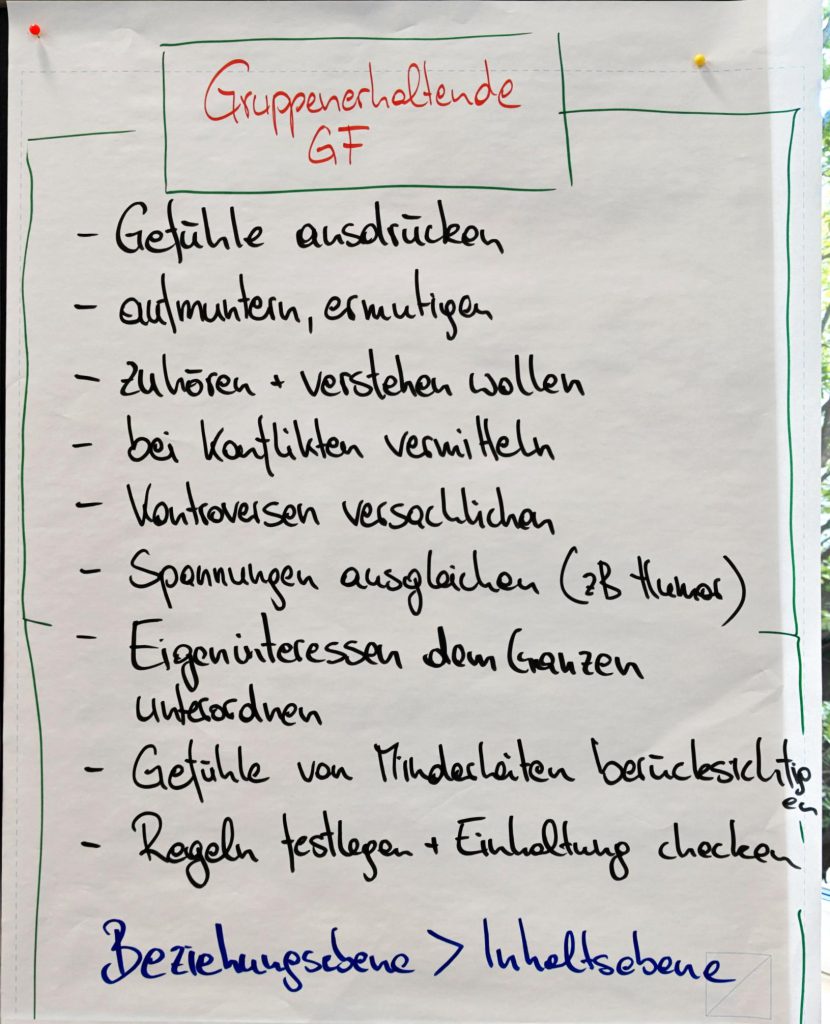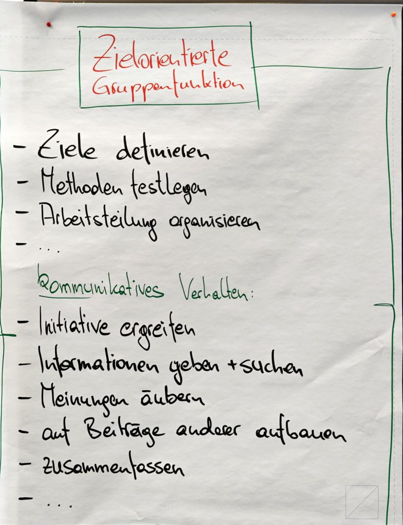 Nach einem gemeinsamen Einstieg – mit einem Steuerungsfeedback zu den Fragen „Was war gestern prägend, irritierend oder unklar?“ – vertieften wir gruppendynamische Modelle zur Analyse von Gruppenprozessen. Im Fokus standen zunächst die vier zentralen Gruppenfunktionen (zielorientiert, gruppenerhaltend, individuell, analytisch).