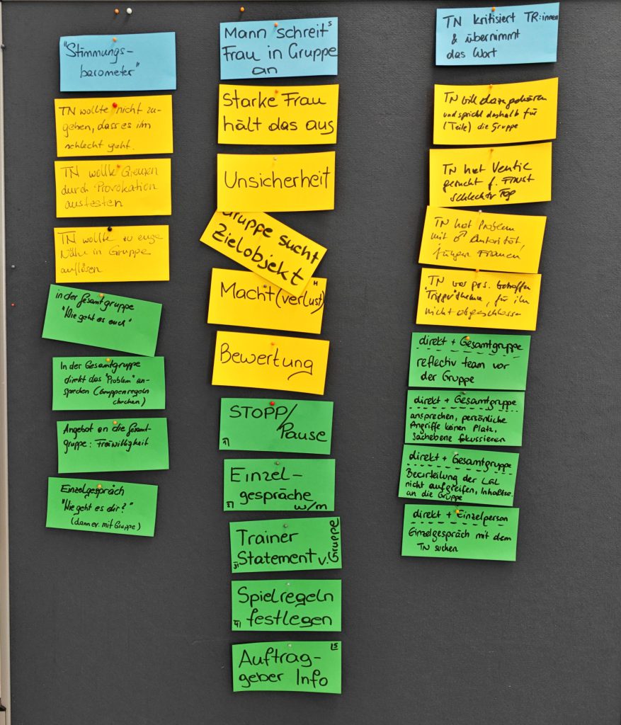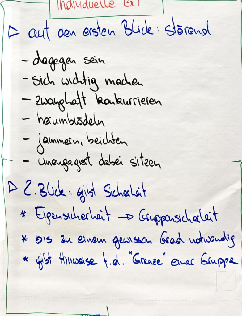 Die Gruppe arbeitete in drei klaren Schritten: wahrnehmen und beschreiben, Hypothesen bilden, bis zur Vorbereitung fundierter Interventionen, mit denen wir uns am Tag 3 beschäftigten. So wurde ein strukturierter, schrittweiser Umgang mit Gruppendynamik erprobt.