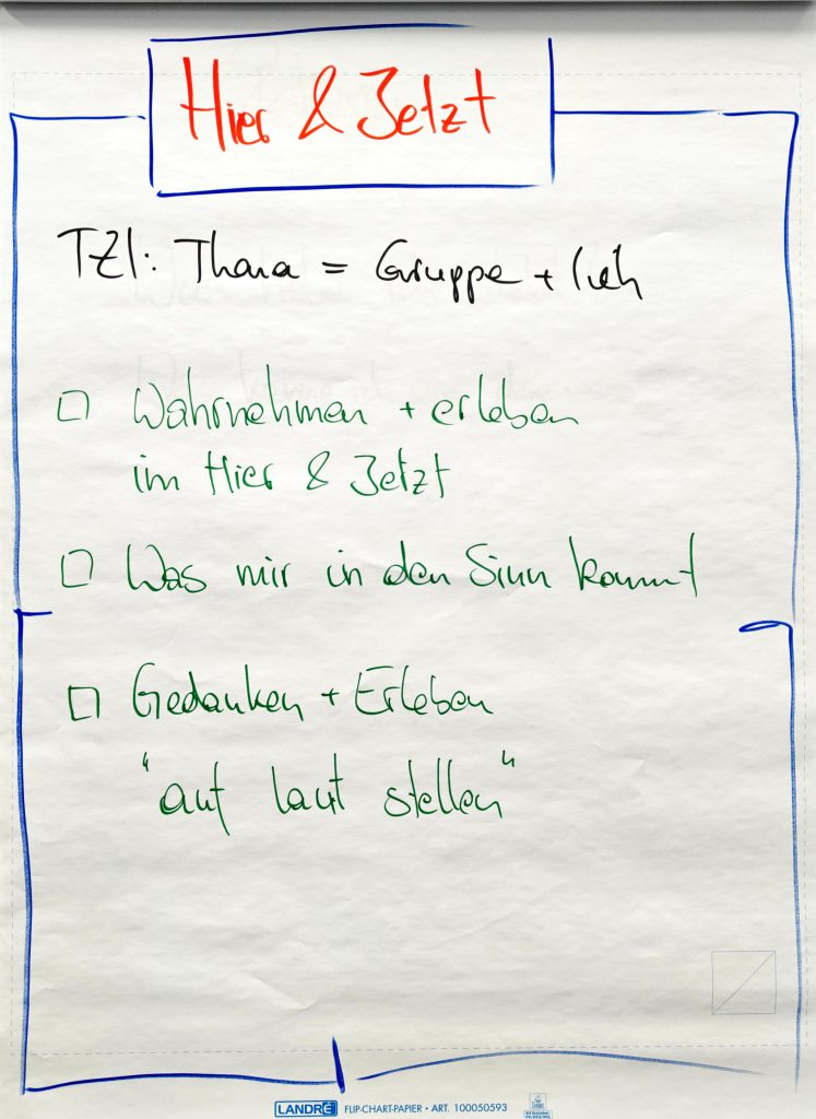 Den Nachmittag widmeten wir dem Lernen über Gruppen im „Hier und Jetzt“. Lernen im Hier & Jetzt als gruppendynamische Arbeitsweise bedeutet, dass Lernprozesse bewusst im aktuellen Moment und im direkten Erleben der Gruppe stattfinden.