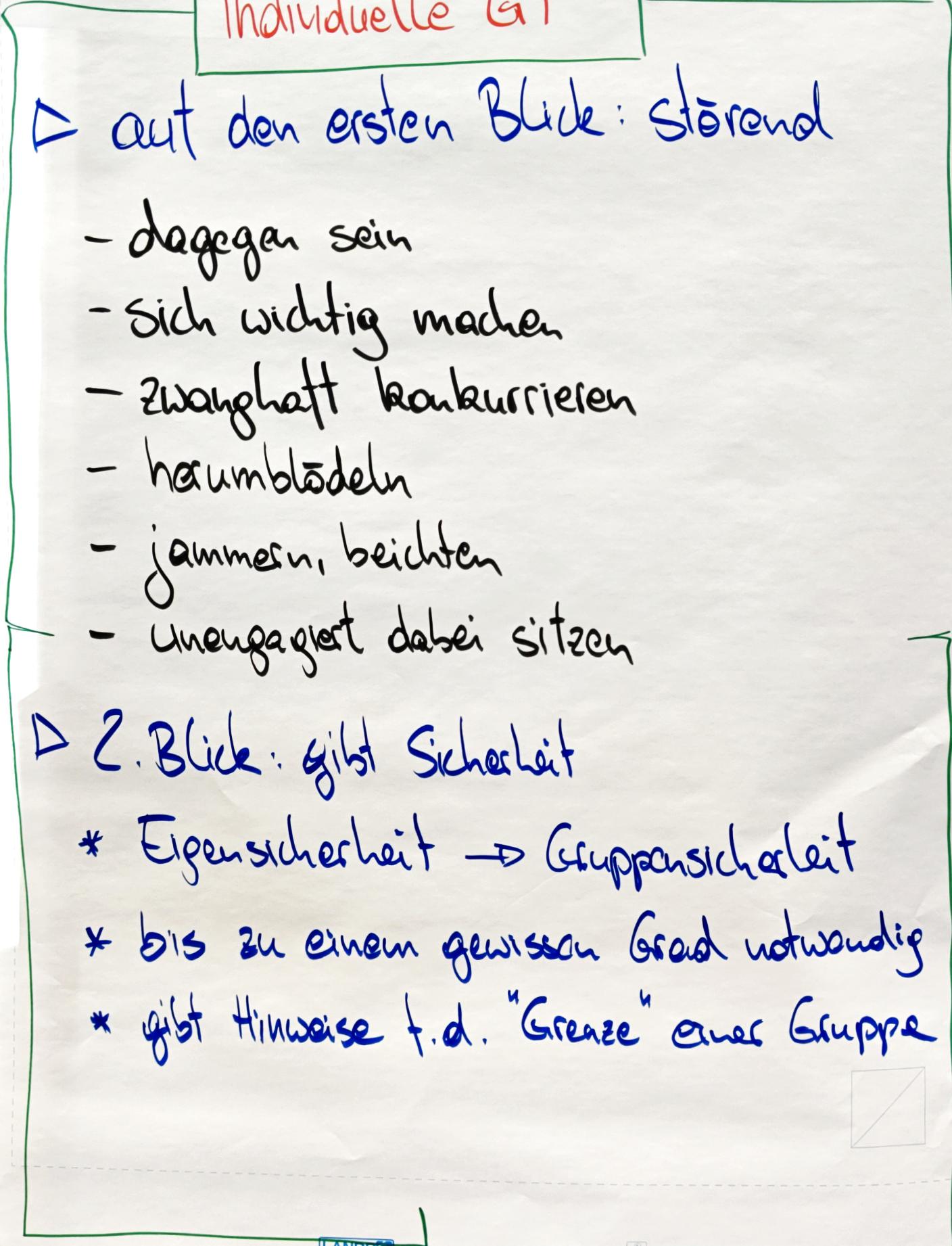 Nach einem gemeinsamen Einstieg – mit einem Steuerungsfeedback zu den Fragen „Was war gestern prägend, irritierend oder unklar?“ – vertieften wir gruppendynamische Modelle zur Analyse von Gruppenprozessen. Im Fokus standen zunächst die vier zentralen Gruppenfunktionen (zielorientiert, gruppenerhaltend, individuell, analytisch).