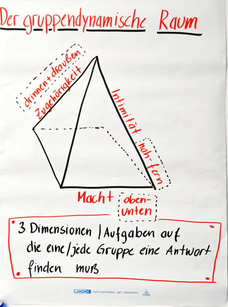 Weiter ging es mit dem gruppendynamischen Raum, der als zentrales Modell dient, um Gruppendynamik anhand von drei Achsen zu beschreiben.