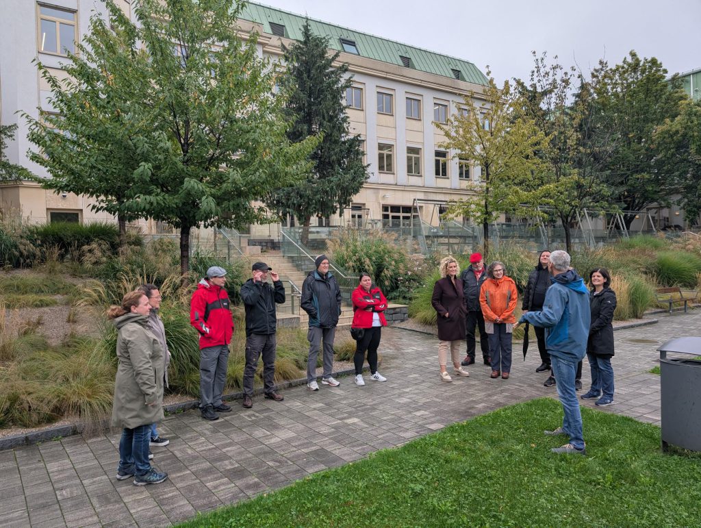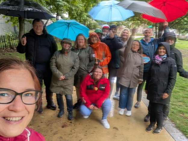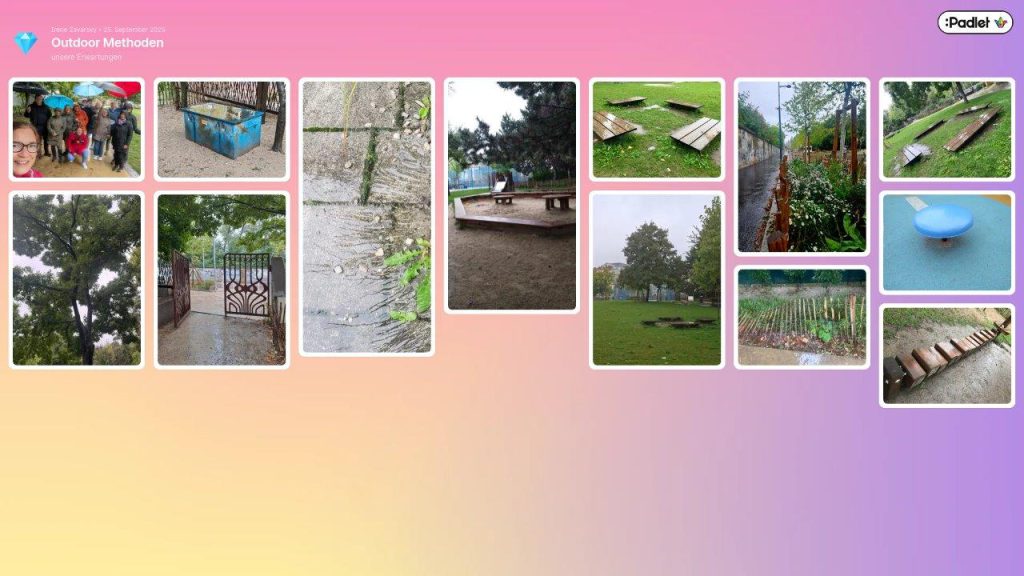 Es war bald klar: Outdoormethoden beleben Lernprozesse, schaffen stärkere Interaktion, fördern Perspektivwechsel und sprechen verschiedene Lerntypen an. Gleichzeitig bringen sie auch Herausforderungen mit sich: Witterung (diese Herausforderung konnten wir ausführlich erleben), Fragen der Barrierefreiheit und mögliche Vorbehalte von Teilnehmenden. Es war gut, die Übungen unter widrigen Wetterbedigungen auszuprobieren: am ersten Tag haben wir uns trotz Regen zu einem Stationenspaziergang in den Park aufgemacht. Das Plaudern zu zweit zum leisen Prasseln des Regens war sogar angenehm. Das Mitschreiben auf Kärtchen war zum Teil eine ordentliche Herausforderung. Nicht alle Kärtchen waren im Seminarraum noch einwandfrei lesbar, aber bei allen konnte der Inhalt noch ermittelt werden. Auch die Übung zu Vertrauen und Verantwortung (ein:e Partner:in war blind und wurde von der/dem anderen mit Handfassung durch die Gegend geführt) war nicht für alle einfach. Körperliche Berührung sind wir in unserem Alltag nicht mehr gewohnt und auch die unterschiedliche Sturz- und Stolperangst macht die Übung herausfordernd.