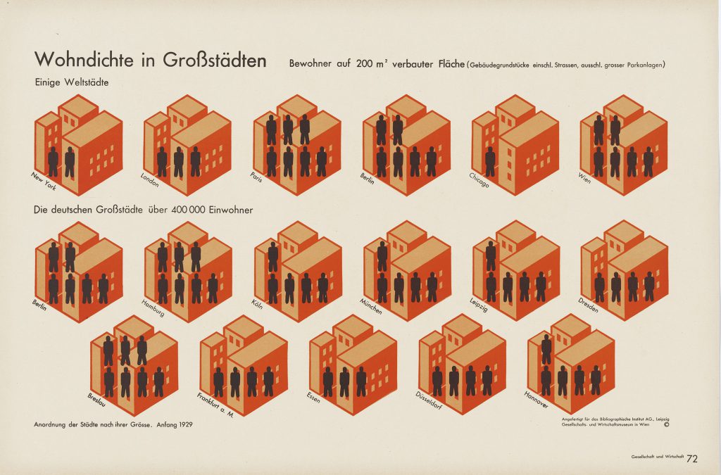 Bildstatistik „Wohndichte in Großstädten“, 1930, Gesellschafts- und Wirtschaftsmuseum (Hg.): Gesellschaft und Wirtschaft. Bildstatistisches Elementarwerk, Leipzig: Bibliographisches Institut, 1916_Marie Reidemeister (later Neurath), ca. 1930; Otto and Marie Neurath Isotype Collection, University of Reading (9)