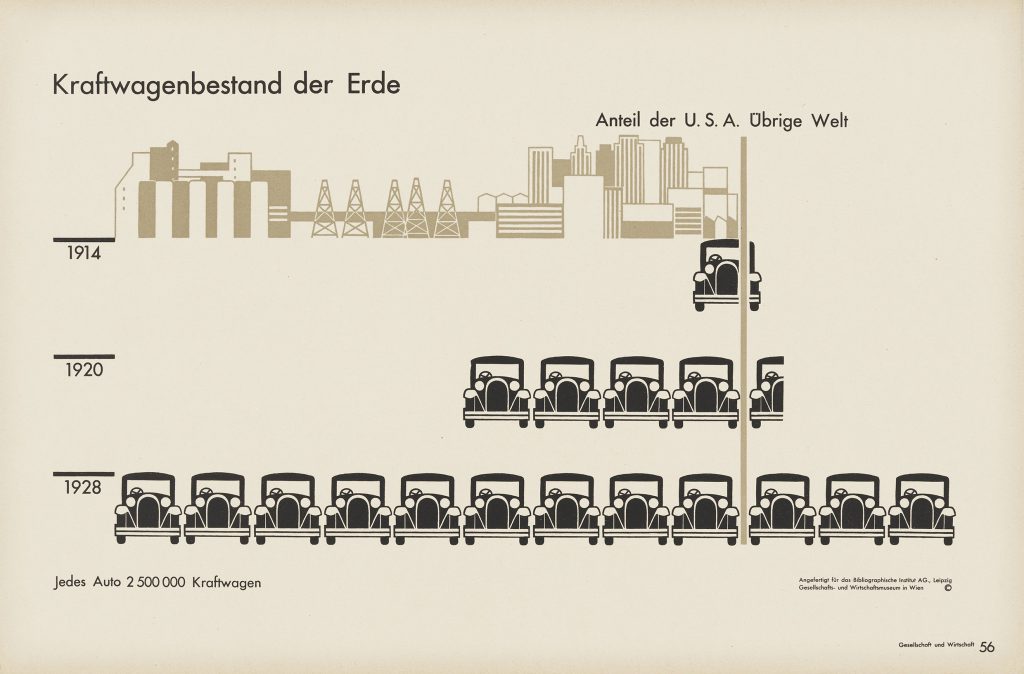 Bildstatistik „Kraftfahrzeugsbestand der Erde“, Gesellschafts- und Wirtschaftsmuseum (Hg.): Gesellschaft und Wirtschaft. Bildstatistisches Elementarwerk, Leipzig: Bibliographisches Institut, 1916_Marie Reidemeister (later Neurath), ca. 1930; Otto and Marie Neurath Isotype Collection, University of Reading (9)