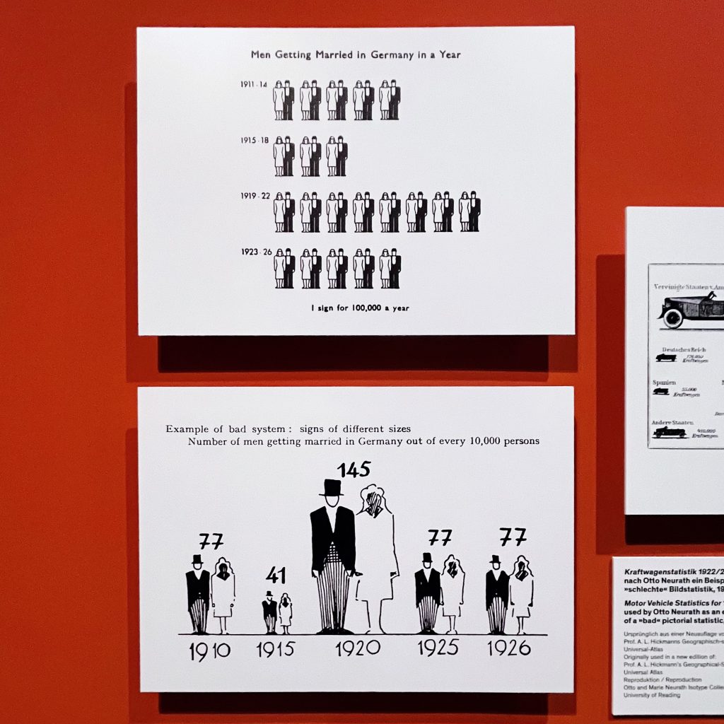 Ich hatte von ISOTYPE (International System of Typographic Picture Education) schon das eine oder andere Mal gehört, aber mich noch nie intensiv damit auseinandergesetzt. Nach wenigen Minuten in der Ausstellung war ich Feuer und Flamme für das Thema, denn es war offensichtlich: da steckt so viel Potential für aktuelle Themen der Bildungsarbeit drin.