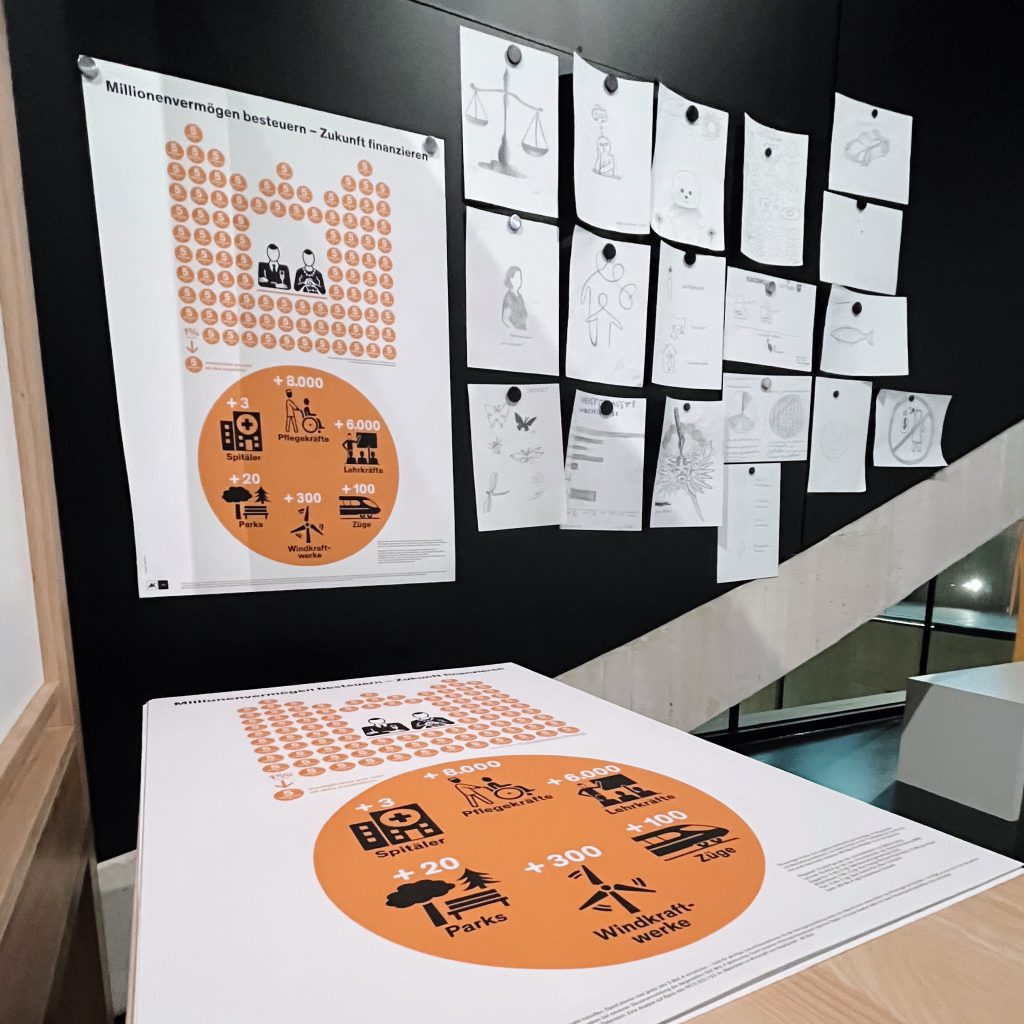 Auch moderne Infografiken bedienen sich ganz selbstverständlich verschiedener Piktogramme, um Zusammenhänge aufzuzeigen und schnell erfassbar zu machen. So auch ein Plakat der AK Wien zum Thema „Millionenvermögen besteuern – Zukunft finanzieren“, das Besucher:innen der Wien Museums als Geschenk mitnehmen können. Mit wenigen Bildern sieht man hier, was alles finanziert, und der Allgemeinheit zugutekommen könnte, wenn eine Steuer von 1% auf Vermögen ab 1 Mio. € eingeführt wird (betroffen wären nur 5% der reichsten Haushalte, deren Vermögen in der Regel um mehr als 5% pro Jahr wächst).