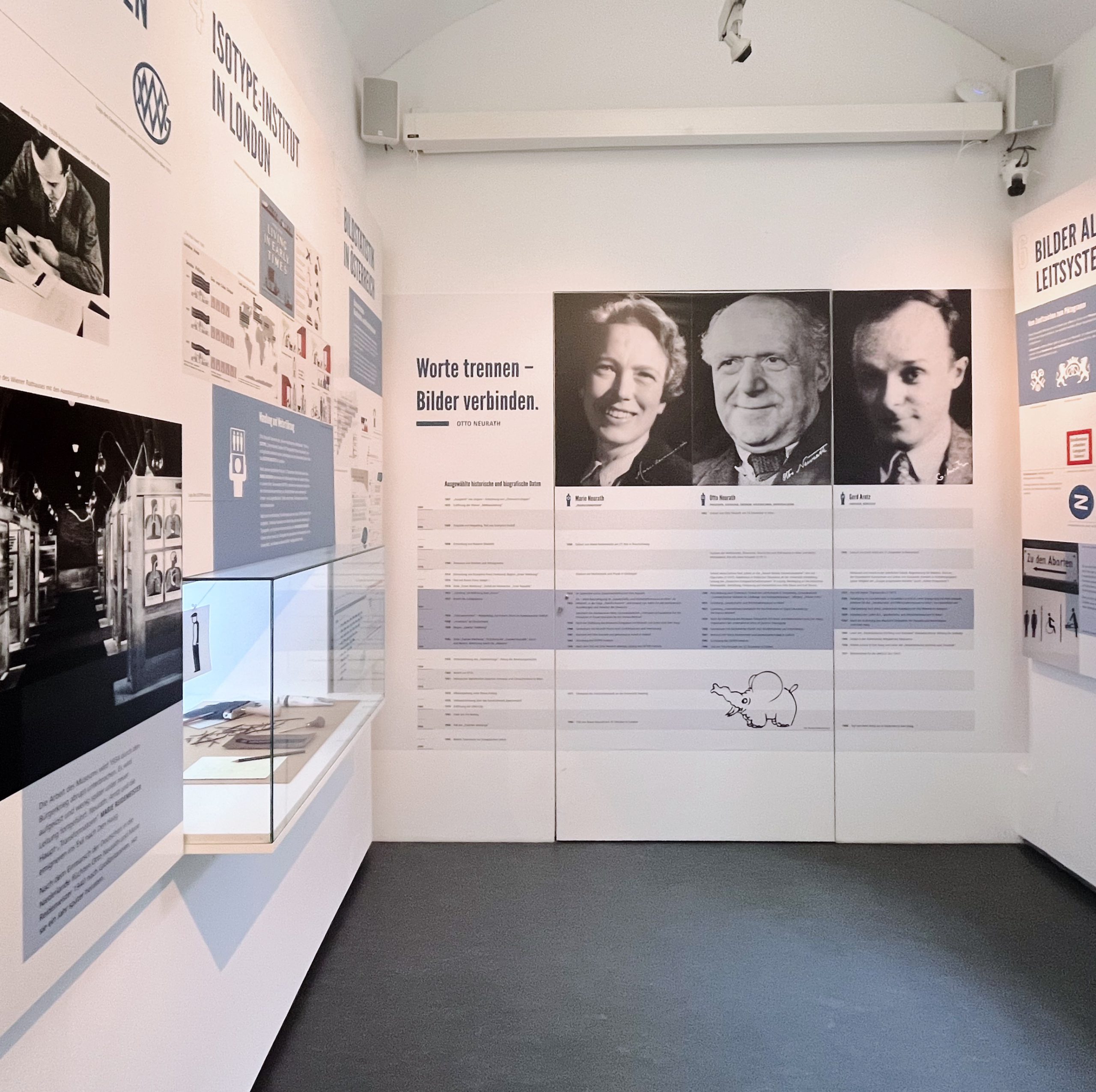 Erlebbar werden die Inhalte durch einen bunten Medienmix, der sich durch die Ausstellung zieht. Fotos und Bild-Beispiele, animierte Illustrationen, Interviews mit Zeitzeug:innen, eine Video-Vorführung von historischem Video-Material basierend auf ISOTYPE Prinzipien, Bücher von Marie Neurath, ein Ansichtsexemplar der Publikation zur Ausstellung, Dioramas, Bildtafeln und vieles mehr.